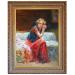 A play of natural light washes in from the left side and lends dimension and shadows to the scene depicting a young lady with fair skin and blonde hair seated casually with legs crossed at the center. The subject is shown at the foot of a bed upon a floral coverlet. Broad, fluid brushstrokes conveying brightly colored flowers on the coverlet are contrasted with the more refined strokes used for the subject, casually attired in blue and red, wearing a pensive expression.