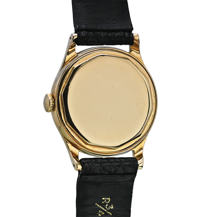 A 17-jewel manual-wind 12-400 movement keeps time with a 40-hour power reserve; it was designed to enhance the shock-resistant suspension of the balance wheel. The time displays on a silvered convex dial with gold faceted hour markers and dauphine hands. A subsidiary seconds register is located at the 6 o’clock position. Fully restored and accompanied by an 18-month warranty