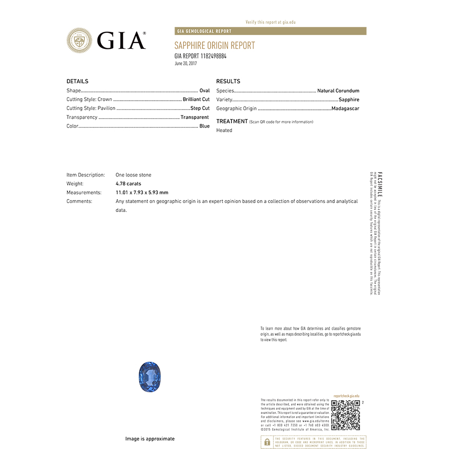 Refined and undeniably striking, this exceptional platinum ring is centered on a magnificent 4.78-carat oval sapphire, GIA-certified to be natural and of Madagascar origin. The sapphire displays a rich, saturated blue with remarkable depth and luminosity, its finely cut oval form maximizing both color and presence.
