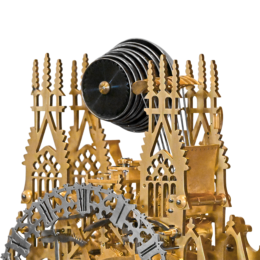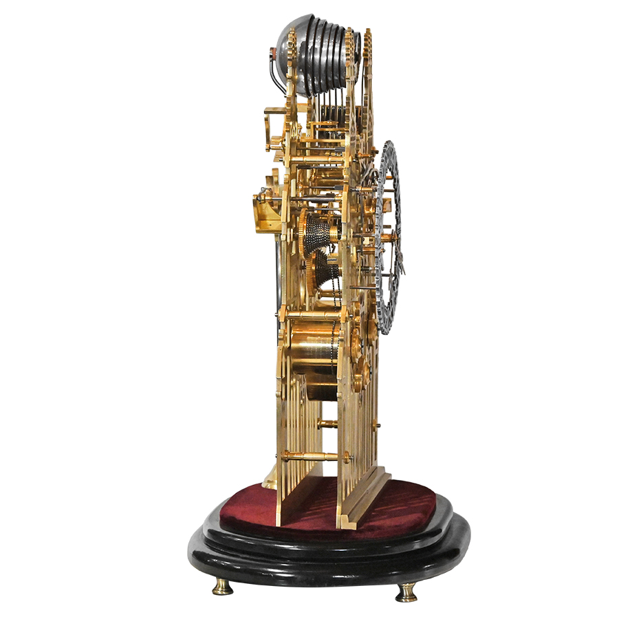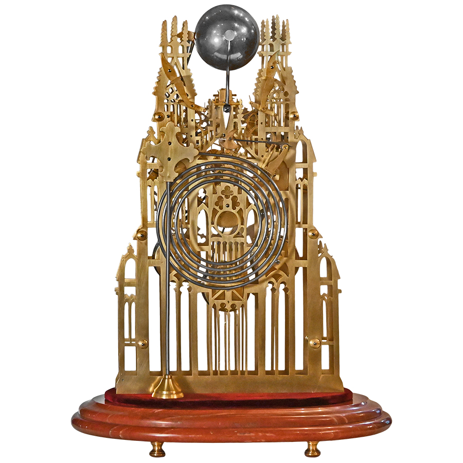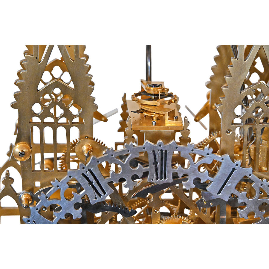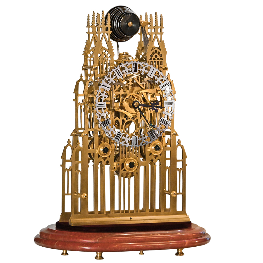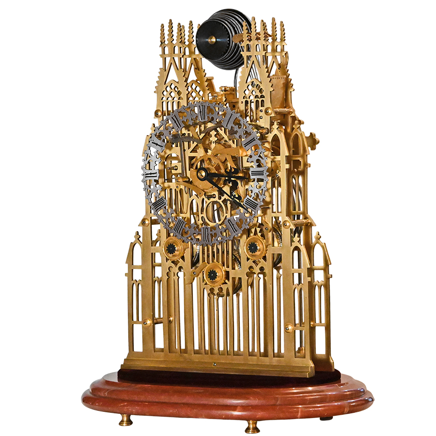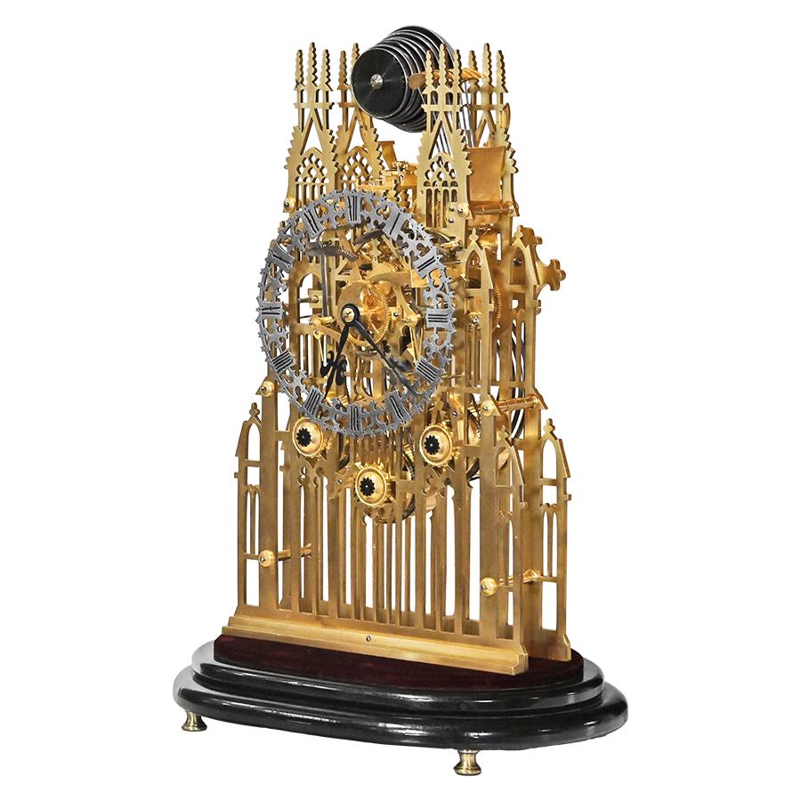 This extraordinary three-train skeleton clock is a masterpiece of English horology, crafted by the distinguished firm of Evans of Handsworth in the 1880s. As much a work of art as it is a triumph of mechanical design, the clock features pierced brass plates that take the shape of the soaring Gothic architecture of York Minster Cathedral.