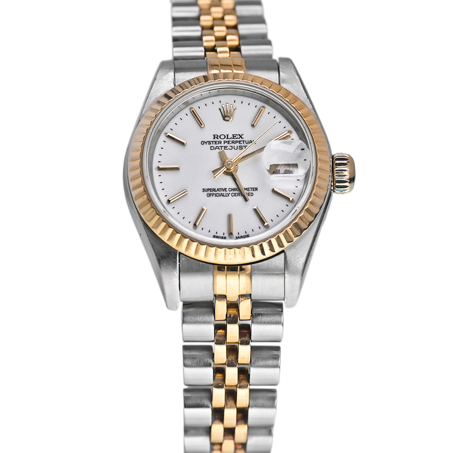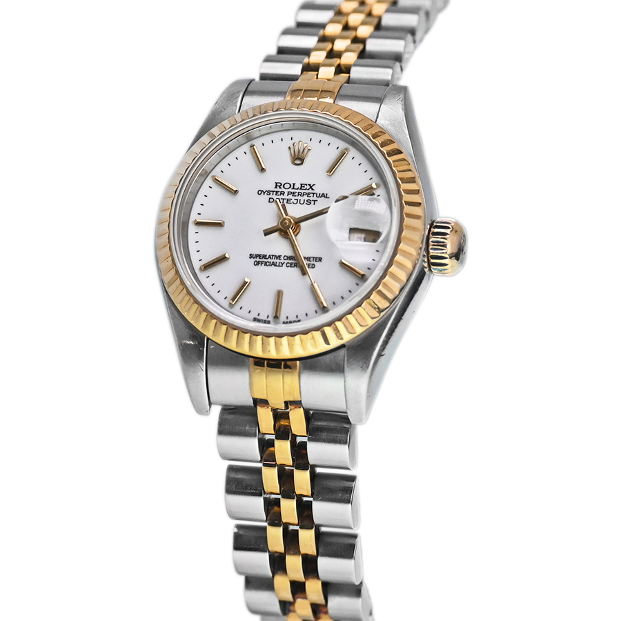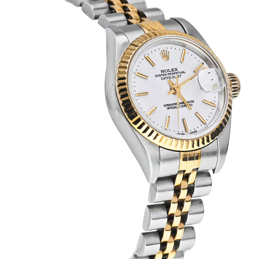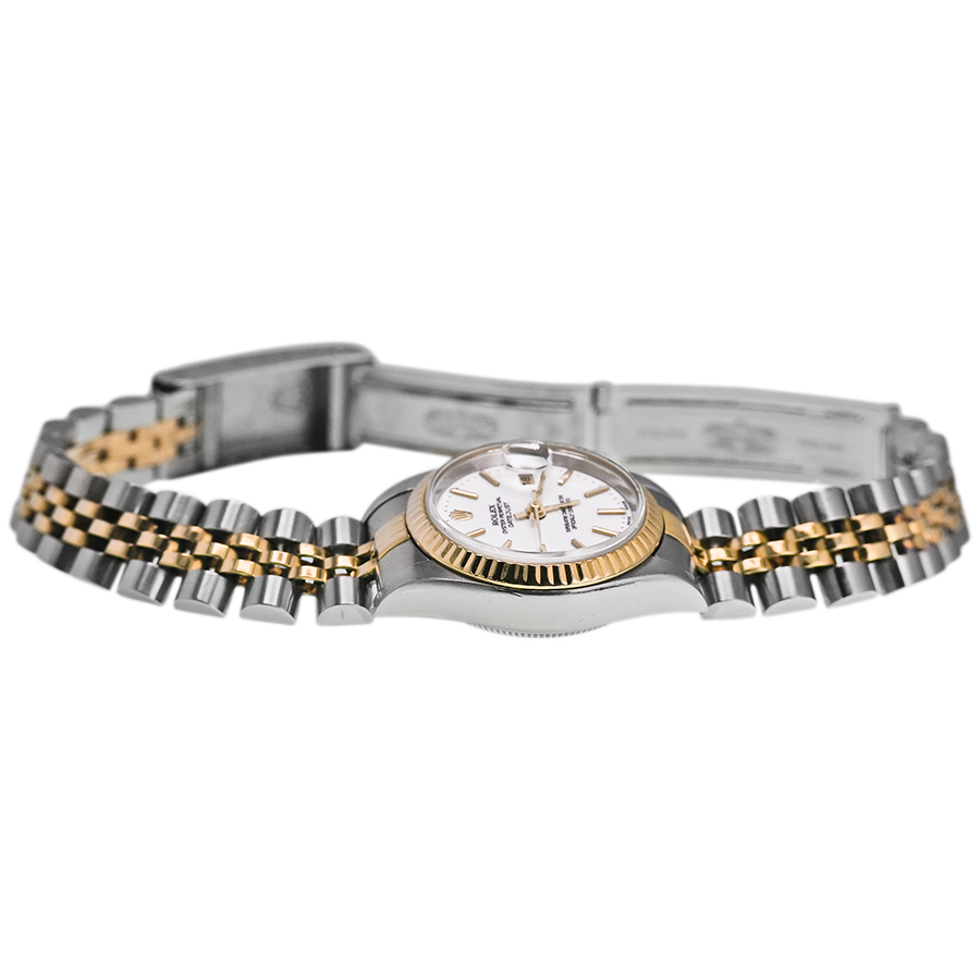 The 26mm Oyster case features the signature fluted bezel in solid 18K yellow gold, framing a white dial with applied gold baton hour markers, sweep seconds hand, and the instantly recognizable Cyclops magnified date window at 3 o’clock. The dial’s minimalist composition enhances legibility while maintaining the refined balance that has made the Datejust a hallmark of Rolex design.