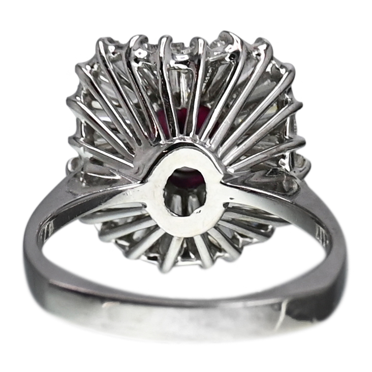 A striking expression of mid-century glamour, this 14K white gold ballerina ring centers on a richly colored oval ruby weighing 1.65 carats. The ruby’s deep, wine-toned hue anchors the design with quiet intensity, its softly rounded form lending warmth and elegance at the heart of the ring.