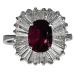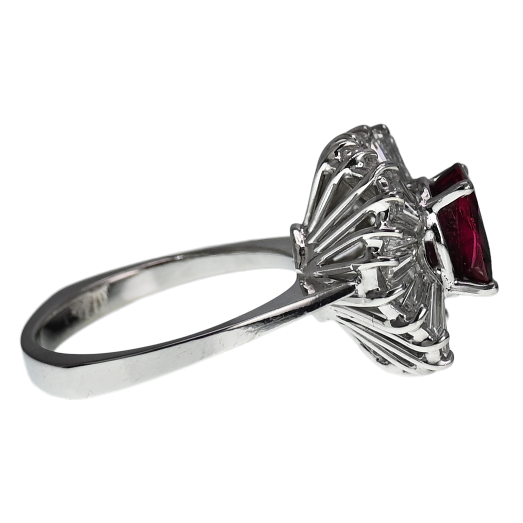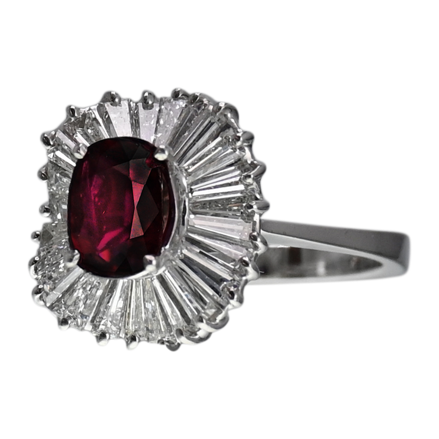 Twenty-four tapered baguette diamonds surround the center stone, radiating outward in a classic ballerina setting, their linear facets creating a brilliant sunburst effect. The diamonds, totaling approximately 2.00 carats, add crisp light and architectural drama, perfectly framing the ruby while enhancing its depth of color. The elevated, sculptural mounting allows light to enter from all angles, giving the ring exceptional presence on the hand.