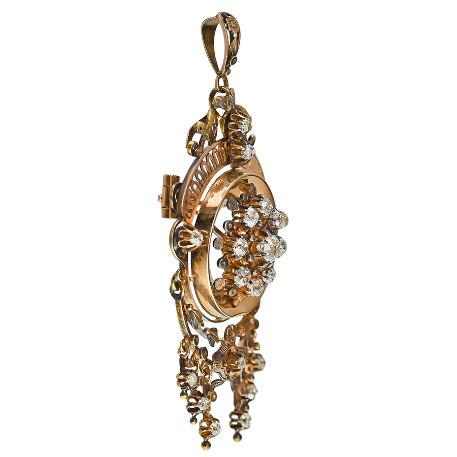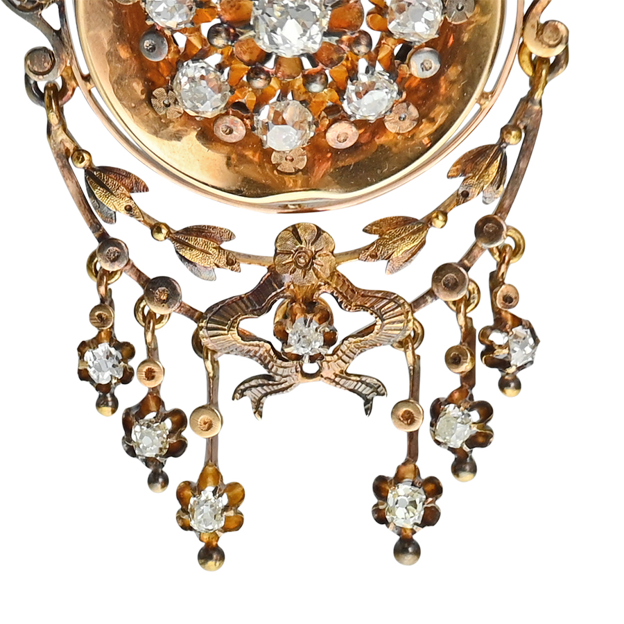 The brooch features a detachable bail, allowing it to transform seamlessly from an opulent pendant to a statement brooch. Bearing a French hallmark, this piece reflects the fine craftsmanship and romantic sensibility that defined the height of 19th-century French jewelry design and is a beautiful relic of the golden age of adornment.